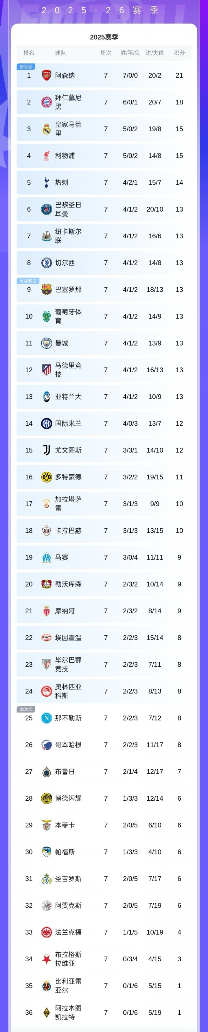 从目前的整体晋级形势来看,直接晋级区的格局呈现出“头部稳固、中后混战”的态势。阿森纳与拜仁慕尼黑表现强势,已成功锁定前8席位,提前斩获淘汰赛入场券,成为本轮赛事中率先上岸的两支豪门。